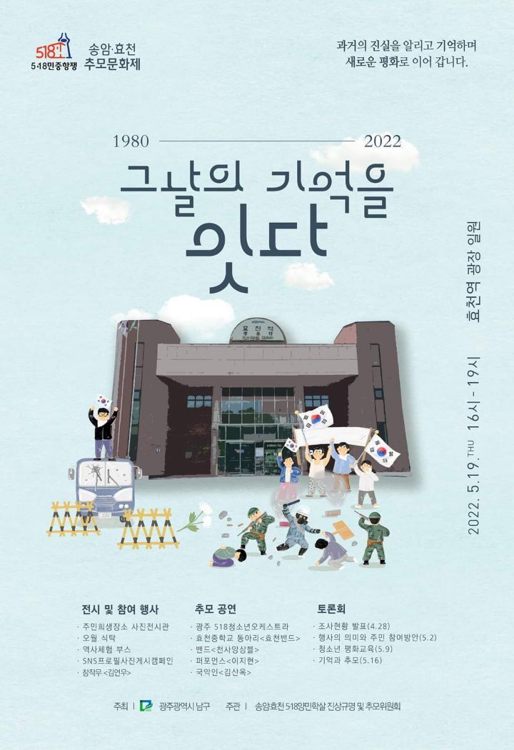 송암*효천 추모 문화제 '그날의 기억을 잇다' 행사에 광주재능기부센터에서는 현수막 참여와 스파클 '푸른물애 호남지사' 이충식 대표님과 인도네시아에서 근무하고 계시는 김유영 선생님께서 기부해주신 생수를 지원했습니다. |