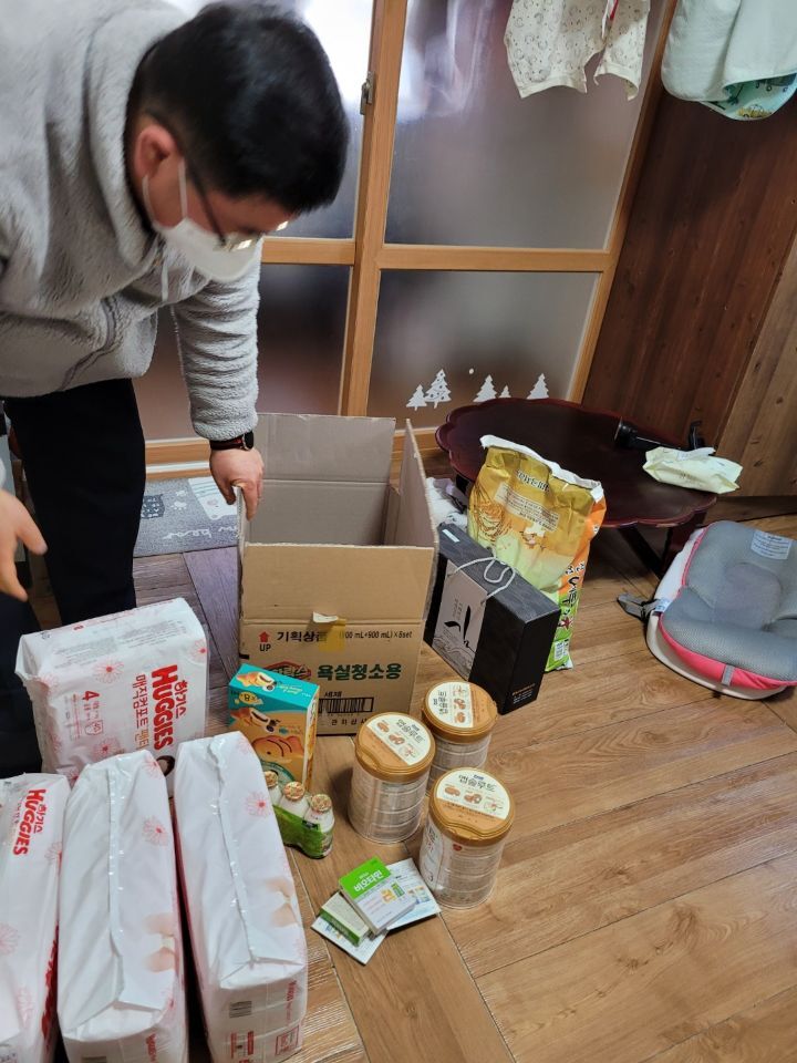 재능기부센터에서는 출산을 한 산모를 위해 미역과 고기를 샀고 각종 음식들과 재료들을 구입해서 지원을 했습니다. 그리고 육아 중 가장 비용이 많이 드는 기저귀와 분유를 지원하였습니다. 또한 각종 생활용품들도 함께 지원했습니다.