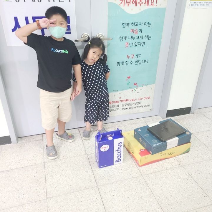'강진군청 환경축산과' 김왕석 주무관님과 아드님이신 김지율군, 따님인 김지안 양이 박카스, 사과, 양말, 김 등을 기부해주시기 위해 광주재능기부센터에 기부해주셨습니다. |