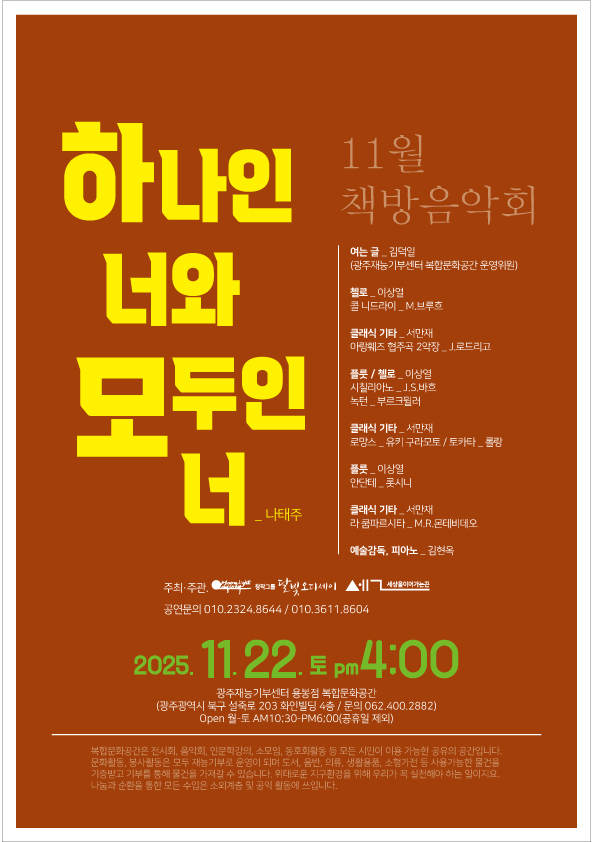 광주재능기부센터 용봉점 복합문화공간 '아낌없이 주는 나무'에서 '11월 책방 음악회'가 개최됩니다.