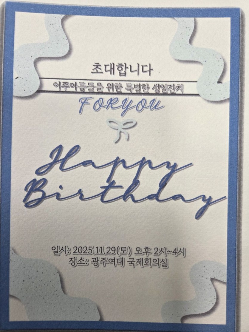제 11 회 무국적 아가들의 특별한 생일잔치를 11월 29일 토요일 오후 2시부터 광주여대 국제회의실에서 진행됩니다. |