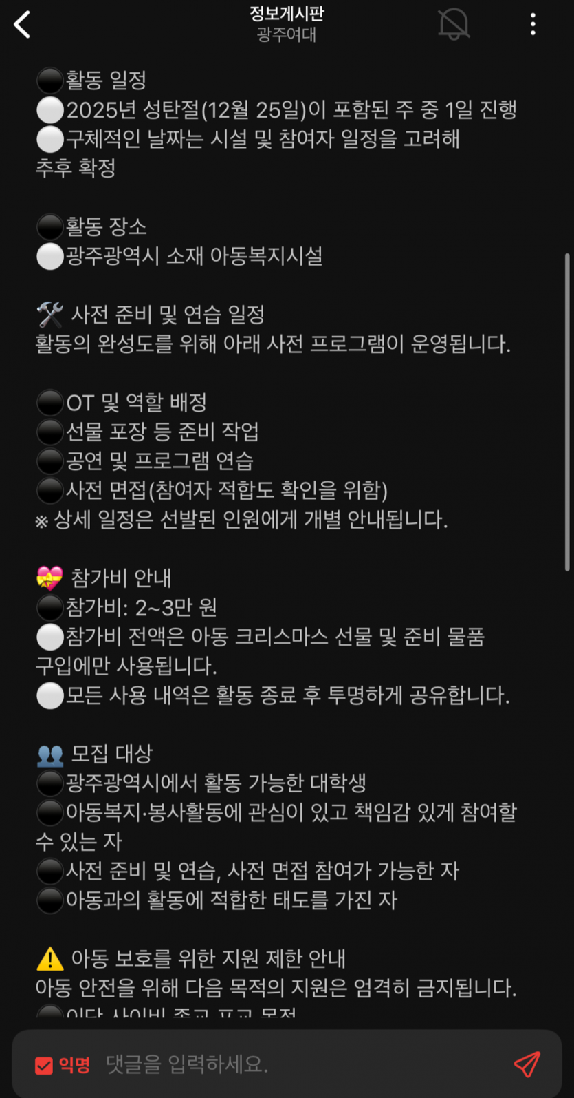 광주재능기부센터에서 진행하는 '사랑의 몰래산타' 행사를 이용하여 몰래산타 행사에 참여하려면 참가비 3만원을 선입금 하라는 내용의 글이 광주지역 대학교 홈페이지에 게시가 되어 있다는 연락을 받았습니다. |