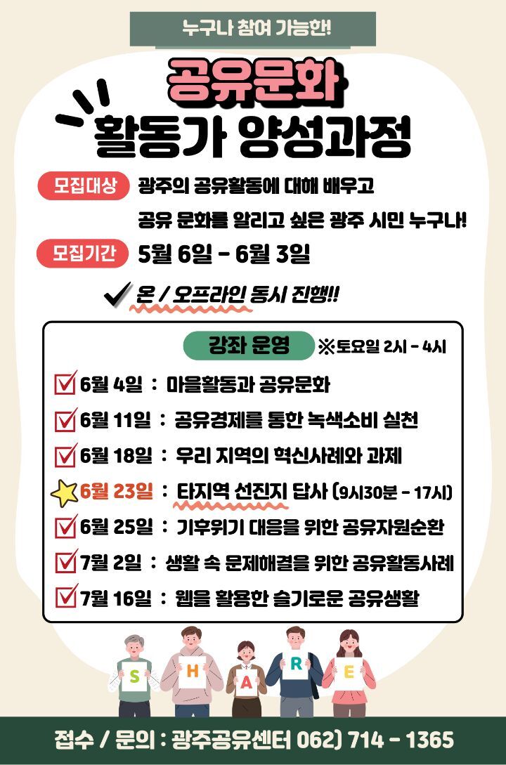 광주 공유센터에서는 '공유문화 활동가' 8기 양성과정을 진행합니다. |