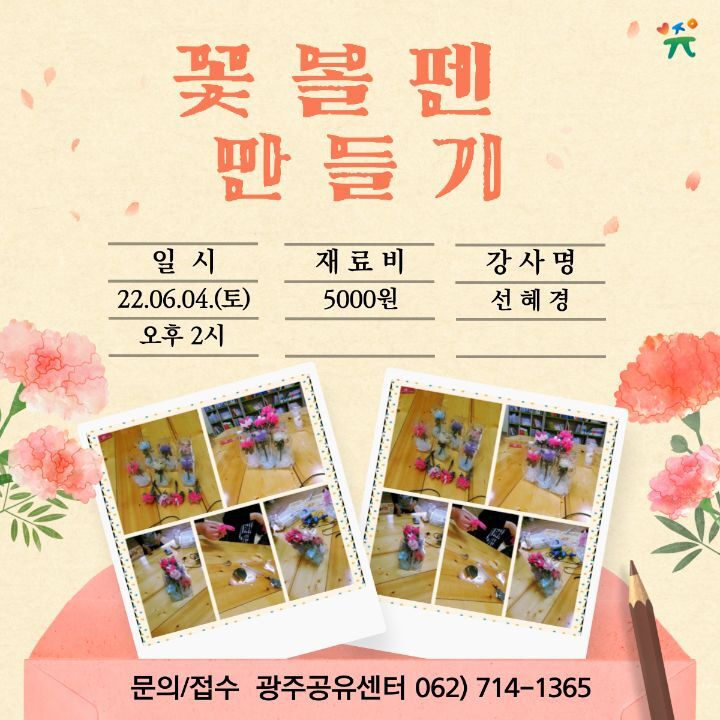 감성 가득 특별한 꽃볼펜을 만드는 체험 참가자 모집합니다. 신청은 광주 공유센터 062-714-1365로 전화주시면 감사하겠습니다. |