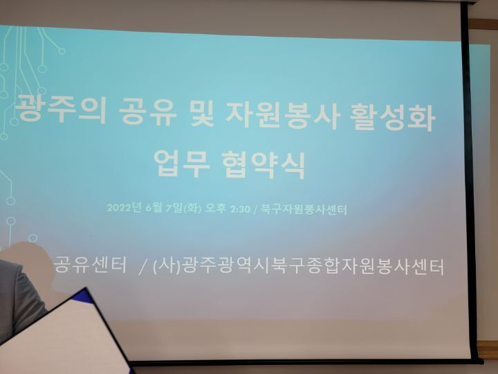 광주의 공유문화 확산 및 자원봉사 활성화를 위한 협약식이 광주 공유센터와 광주 북구 자원봉사센터 간에 이루어졌습니다.