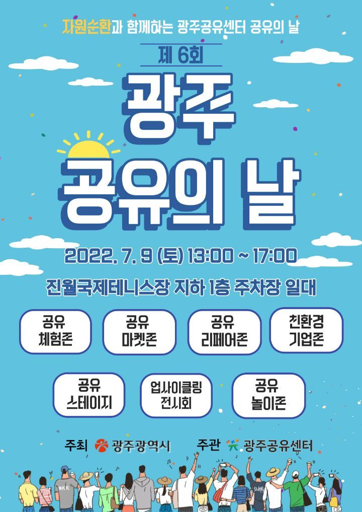 제6회 광주 공유의 날 행사가 7월 9일 토요일 오후 1시부터 5시까지 진월국제테니스장 지하 주차장에서 진행됩니다.