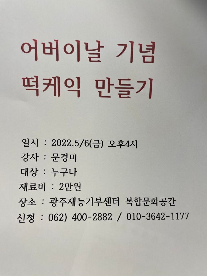 용봉점/ "어버이날 기념 떡케잌 만들기" 특강 참가자 모집 안내