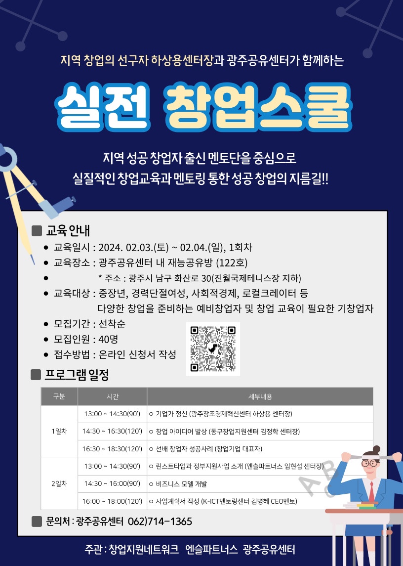 지역창업의 선구자 하상용 센터장님과 광주 공유센터가 함께 하는 실전 창업스쿨에 초대합니다. |